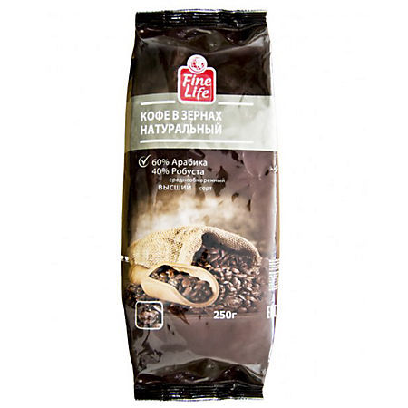 Кофе в зернах Fine Life Арабика 60%, Робуста 40%, 250гр с доставкой по Новосибирску.Если товара на момент формирования заказа не окажется в наличии, наш оператор свяжется с вами и предложит альтернативу.