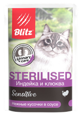 Корм влажный Blitz Sensitive для стерилизованных кошек с индейкой и клюквой, кусочки в соусе, 85г