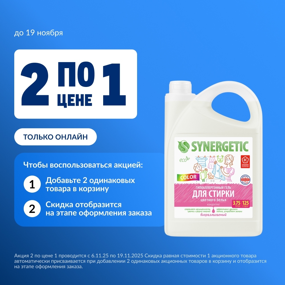 Гель для стирки концентрированный Synergetic Color для стирки цветного белья, 3.75л с доставкой по Новосибирску.Если товара на момент формирования заказа не окажется в наличии, наш оператор свяжется с вами и предложит альтернативу.