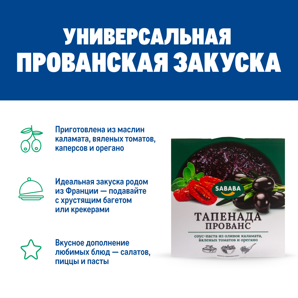 Тапенада Sababa Прованс, 150г с доставкой по Новосибирску.Если товара на момент формирования заказа не окажется в наличии, наш оператор свяжется с вами и предложит альтернативу.